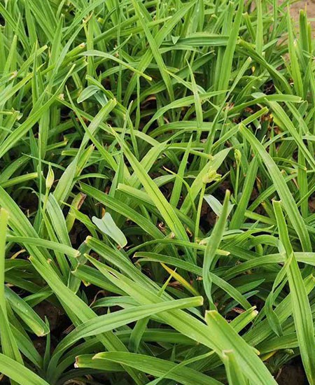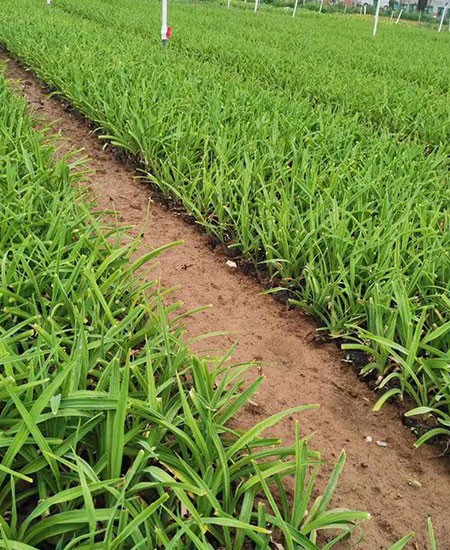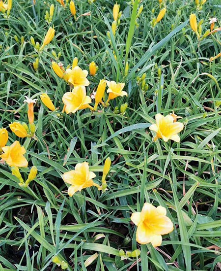 金娃娃萱草(學(xué)名:Hemerocallis fulva ‘Golden Doll’):是萱草的人工栽培的園藝品種。地下具根狀莖和肉質(zhì)肥大的紡錘狀塊根。葉基生,條形,排成兩列,長(zhǎng)約25厘米,寬1厘米。株高30厘米,花莛粗壯,高約35厘米。螺旋狀聚傘花序,花7至10朵?;ü诼┒沸?,花徑約7至8厘米,金黃色?;ㄆ?至11月(6至7月為盛花期,8至11月為續(xù)花期),單花開放5至7天。 花期長(zhǎng),葉叢綠色期長(zhǎng),花徑大,單花時(shí)間長(zhǎng),株型矮壯。且早春葉片萌發(fā)早,翠綠葉叢美觀。