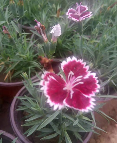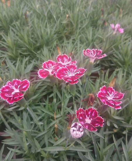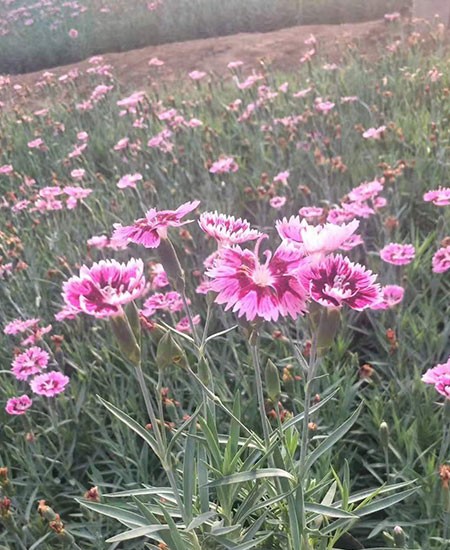 彩虹石竹為多年生常綠草本植物?;ㄆ跒樗脑轮潦?,花色為復式花,葉片呈現(xiàn)銀灰色冬天艷亮是觀花觀葉的雙優(yōu)品種。其耐43度高溫、耐零下20度低溫,喜光、耐干旱、耐瘠薄。多年生草本,高30-50厘米,全株無毛,帶粉綠色。莖由根頸生出,疏叢生,直立,上部分枝。葉片線狀披針形,長3-5厘米,寬2-4毫米,花單生枝端或數(shù)花集成聚傘花序;花梗長1-3厘米;苞片4,卵形,長達花萼1/2以上,邊緣膜質,有緣毛。